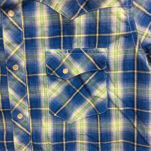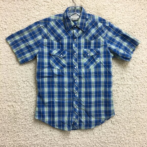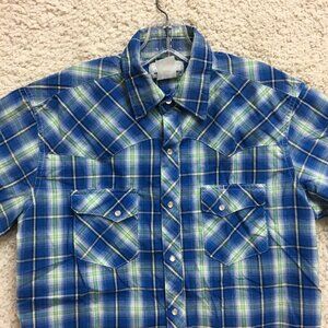 Wrangler Button Up Shirt Medium Men Blue Plaid Pearl Snap Pockets Western Cowboy