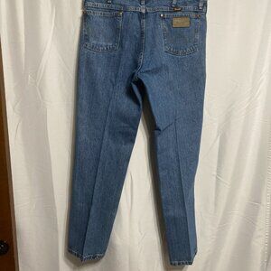 Wrangler Cowboy Cut Slim Fit (936RST) 36x32 Blue Jeans. Crafted from a comfortable cotton. Medium wash. Listed size: 36x32. Approximate hand measurements — waist: 35", inseam: 31.5". Gently worn with minimal signs of previous use.