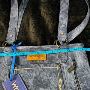 Wrangler Denim Blue Purse Brand New. Has inside zipper pocket and opened pocket. Wrangler pocket on the outside with maybe concealed carry pocket. Width, Height, and Depth are in pictures.