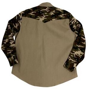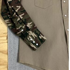 This men's size XL Oversized shirt features a tan camo pattern, pearl snap closures, and classic western styling. Perfect for hunting, cowboy attire, or casual wear.