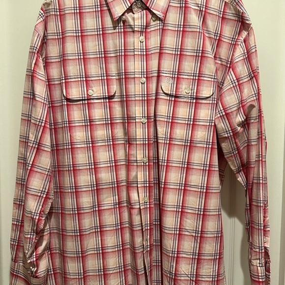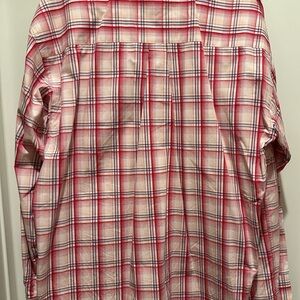 This Wrangler shirt features a classic red and white plaid pattern, with orange tones. Perfect for a laid-back look. Made from a comfortable cotton blend, it's ideal for everyday wear. The casual button-down design makes it a versatile addition to any wardrobe.