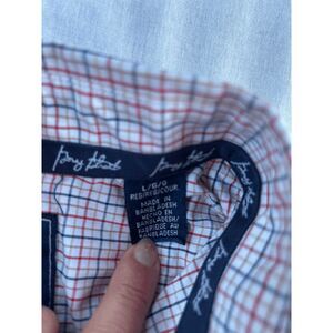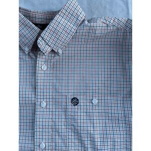 This is a set of two Wrangler button down shirts from the George Strait collection. They are both a size large and are in great condition. One is a blueish plaid, and the other is a white with red and blue checker lines on it. They are 85% cotton and 15% polyester.