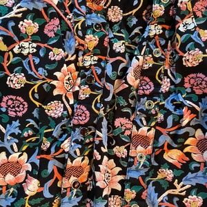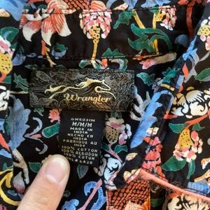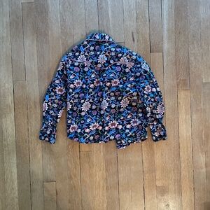 Girls rodeo blouse by Wrangler. Black, pink, and blue color palette, long sleeves, collared, full front button up, black pearl snap buttons, sweet flower pattern throughout, and pink western seaming on chest. Excellent used condition! Great for 4H or rodeo showing!