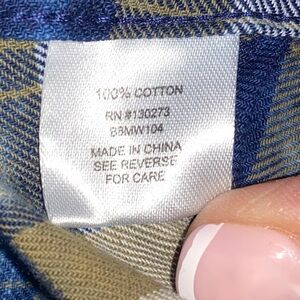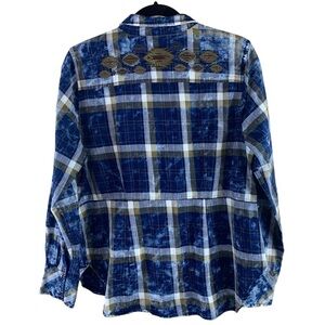 Blue, olive green& white plaid western, snap front shirt. Bleached-distress style. Silver star buttons. Embroidery on back. Long sleeves. Runs a bit small so size up for a more relaxed fit. 100% cotton