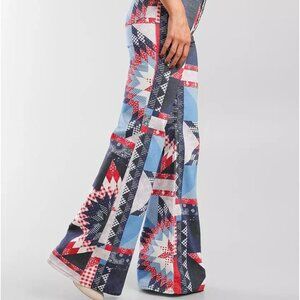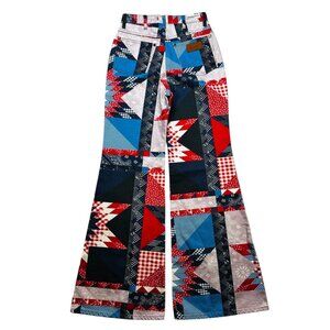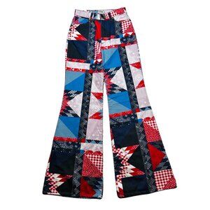 70s inspired flares covered in an eye-catching patchwork print for a touch of Americana. The slim fit hugs you in the right places making you ready to show up and show out.