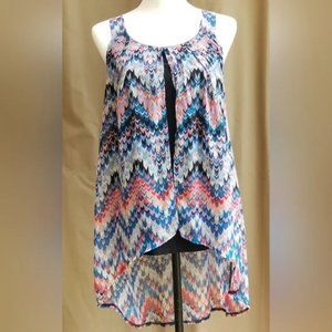 Such a cute summer tunic with a solid black tank underneath and a blue, black and pink top layer that is semi sheer.