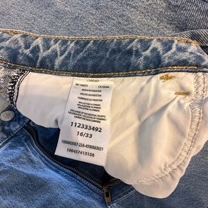 Relaxed fit with distressed details. Casual and stylish. Has a partial ripped belt loop. See pictures