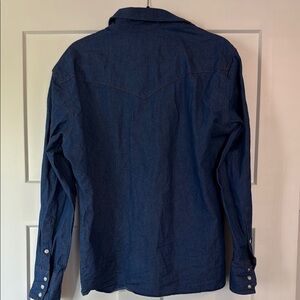 Stylish Wrangler shirt in deep indigo. Features button closure and dual chest pockets.pearl like snap buttons great condition