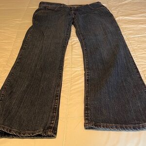 Classic indigo jeans with distinctive contrast stitching. Features iconic back pocket design. Wrangler brand jeans, never worn, no tags.
