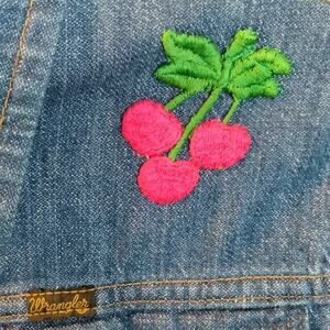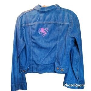 This unique one of a kind jean jacket has pink cherries on one shoulder, a Bob Dylan patch on the other shoulder, embroidery going down the front buttons and a purple Dove in a heart on the back. Pre-owned see photos for details