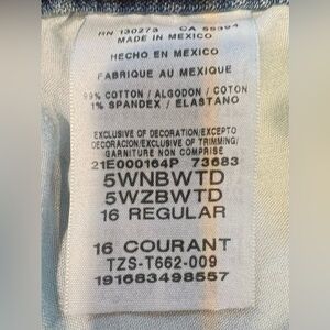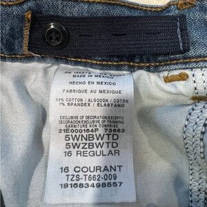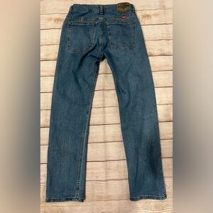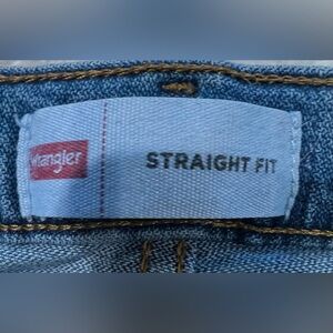 These Wrangler Jeans are perfect for any casual occasion. The jeans are made of a blend of spandex and cotton denim material, which provides a comfortable fit. They come in a solid blue color and feature a straight leg style with an adjustable waist closure for boys' size 16. The jeans are designed with a zip closure and are not vintage. The brand is Wrangler and the fit is regular. These jeans are ideal for boys who love to wear jeans and want to look stylish. 28 inch adjustable waist, 10 inch rise and 30 inch inseam. Smoke-free home.