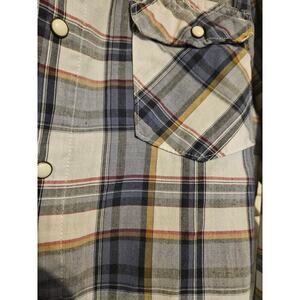 EUC size large cotton polyester mix long sleeve snap button shirt. Blues,reds and white. Pearlized buttons. Armpit to armpit 24 in and shoulder to hem 29 in.