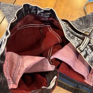 Color: Red denim with white/gray acid wash; can take on a grayish or brownish tone depending on the light and how you pair it.