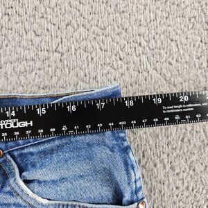 Condition: Good used condition with moderate wear, including visible distressing and fraying at hems, some light marks, and a small hole on the right leg as shown in photos
