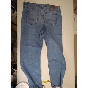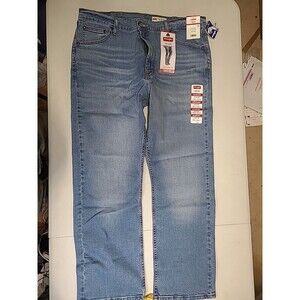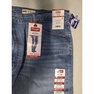 The product is a pair of Wrangler Men's Size 40x30 Light Blue Five Star Relaxed Boot Denim jeans. Made from a blend of cotton and elastane, these jeans feature a mid-rise, bootcut style with a relaxed fit. The denim fabric is medium wash and has a solid pattern, with accents including a button and zipper closure, as well as a 5-pocket design. The jeans are branded with the Wrangler logo and are suitable for all seasons. Look closely at the pictures for condition