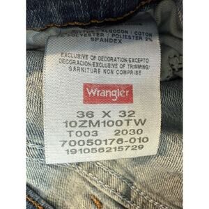 The product is a pair of Wrangler jeans in size 36x32 with a medium wash and relaxed fit. They feature a solid blue color, made of cotton denim fabric with a mid-rise waist. The jeans have a zip closure and straight leg style, perfect for a cowboy theme. This classic pair of Wrangler jeans is ideal for men looking for a comfortable and stylish addition to their wardrobe.
