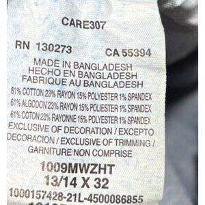 Measurements: Waist = 32 inches, Inseam = 30 inches, Rise = 10 inches.
