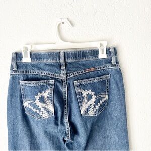 DETAILS: Wrangler jeans women's 5/6 x 34, Cash no gap waistband, bootcut with slit in hems, white W stitching on pockets. 100% cotton, machine wash.