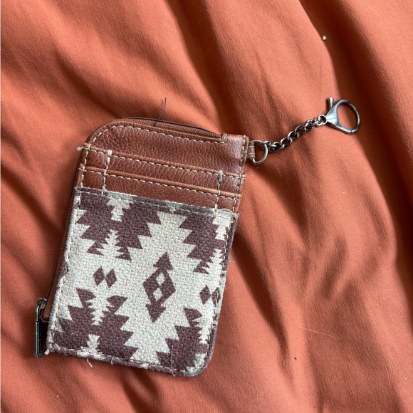 Stylish wallet with a tribal pattern. Features a keychain attachment. Perfect for on-the-go use.