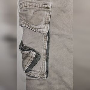 Stylish khaki cargo pants with multiple pockets. Perfect for casual wear. Has adjustable waist, pocket designs, cargo pockets, no stains, and does show signs of wear only at bottom of pants . see photos
