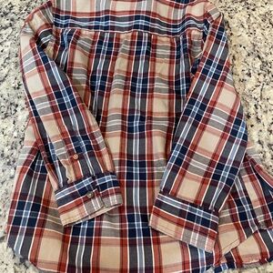 Stylish plaid button-down shirt. Features red, blue, and tan colors. Perfect for casual wear.