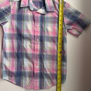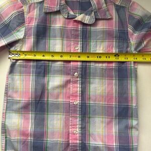 Pink and blue with green and yellow gingham button down shirt by Wrangler. Marked boys size S 6/7 but would look cute on either boy or girl. Material is 60% cotton, 40% polyester and made in Bangladesh. In really good condition.