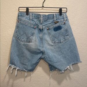 Classic light blue denim shorts. Ideal for everyday style. High waisted, has multiple pockets, zip fly, stretch, good inseam length, the perfect Wrangler cut off! Wrangler size 32