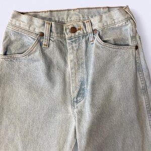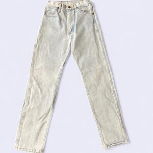 Classic light wash straight-leg denim with naturally faded details for that perfect worn-in look. Timeless Wrangler style, women’s size 7 x 32. Made in the USA, which means these jeans are at least 21 years old—Wrangler stopped U.S. production after 2004. A true vintage western piece, perfect for adding authentic style to your wardrobe.