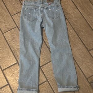 Trendy Wrangler jeans with a ripped design. Light blue shade for a modern look. I make these and am willing to make any size you would like! They run in men’s so they have big pockets and fit your but to look like a cowboy!❤️ I make my own jeans in this brand because how good they look on me and I’m always getting ask where I bought my jeans so I started making them for everyone!