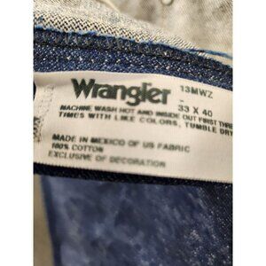These Wrangler 13MWZ Cowboy Cut jeans feature a durable classic fit design tailored for a longer inseam of size 33x40, specifically crafted from 100% cotton denim for a rugged and traditional feel. Made in Mexico with US-made fabric, this pair of jeans boasts the iconic Wrangler rear pocket stitching and leather patch, emphasizing style and authenticity. The zippered closure and strong stitching further ensure longevity and practicality for versatile daily and workwear use. Care instructions on the tag recommend machine washing with like colors to maintain the fabric's integrity.