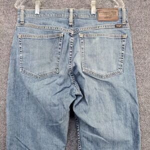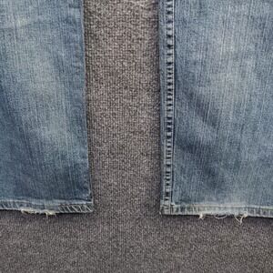 Condition: Basic 5-pocket relaxed straight-leg jeans. Stone wash denim. Distressed. Ankle wear. Blemish on front as pictured.