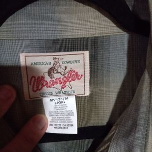 Casual Wrangler shirt with a plaid design. Features button-down front and dual chest pockets. Ideal for everyday wear.
