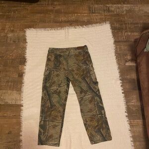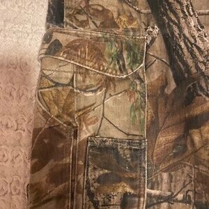 Camouflaged Jeans , Size 38x32 very lightly worn. Small hole above front cargo pocket included in second picture, not bad at all. Pants still have lots of life. very comfortable . Fit well over boots. 100% Cotton.