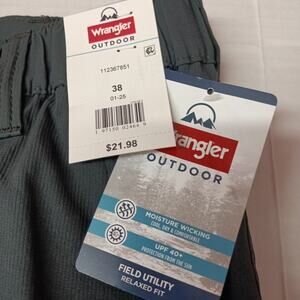 The Wrangler Men's Performance Field Utility Shorts in Jet Black, size 38, offer a relaxed fit and a variety of features suitable for travel, casual wear, and work. Made of polyester, these shorts feature a solid pattern with a zip closure and a high rise waist. They are designed for outdoor activities with UV protection, stretch for comfort, and moisture-wicking properties. The cargo pockets provide a practical storage option, making these shorts a versatile choice for the summer, fall, and spring seasons.