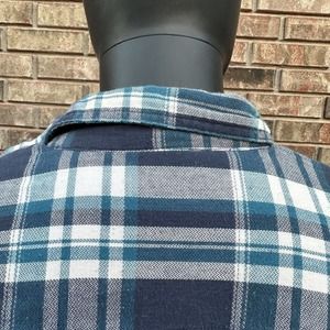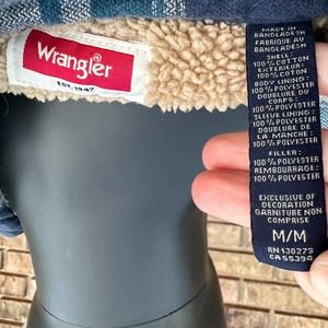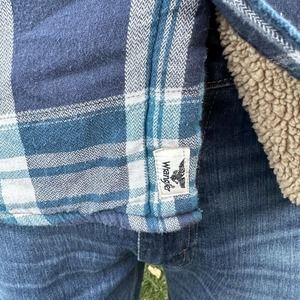 Wrangler plaid Sherpa lined jacket is a blue and white color in plaid. The jacket is size medium.