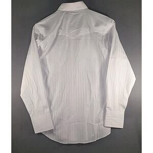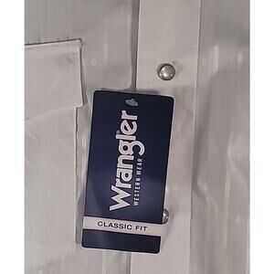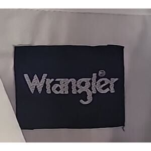 Authentic Wrangler Western pearl snap shirt in crisp white with subtle striping — a timeless cowboy classic built for both comfort and durability. Features pearl snap buttons, pointed yokes, and chest flap pockets for that signature Western style. Perfect for rodeo events, ranch work, or everyday wear.