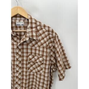 Brown and white plaid pearl snap button down short sleeve shirt. Button front closure, collared neckline, short sleeves.