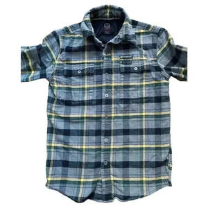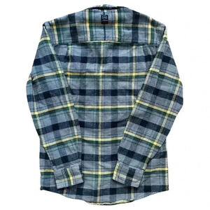 Long sleeve with metal buttons; plaid flannel print. Two button pockets on the front. 100% cotton. Gray/blue/green/yellow colorway. Great for casual, everyday wear or for outdoor and workwear.