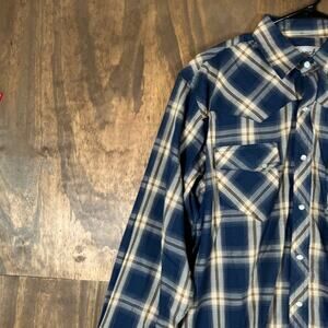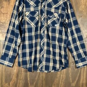 Wrangler Mens Shirt Blue Tan Plaid Wrancher Flannel Pearl Snap Large