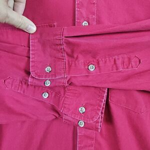 Bright red Wrangler button down long sleeve shirt. This is the x-long tails with single needle tailoring. Made of 100% cotton and the tag size is 17 1/2 - 36, making it measure like an extra large.