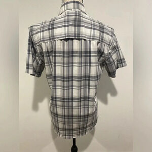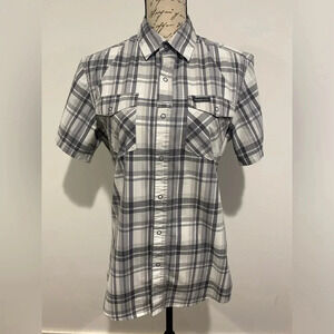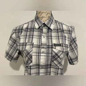 Lot includes black, white, gray plaid snap front, short sleeve shirt and light green and white plaid snap front shirt sleeve shirt. Both shirts size small.