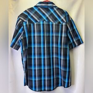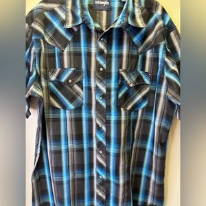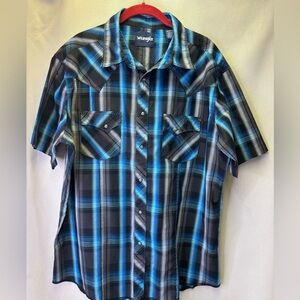 Wrangler Men’s Short Sleeve Shirt with rancher's crease styling in the front, a pointed front yoke and a sawtooth-inspired back yoke Size X-Large in gently used condition