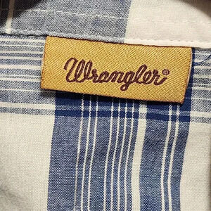 Men's size medium, Wrangler, button up shirt. Long sleeve with pearl snap buttons. Two front flap pockets, plaid with blue and white and metallic stitching in places. Cotton and polyester, made in Bangladesh, machine washable.