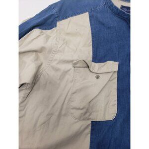 Condition is preowned. Wrangler Men’s Two-Tone Denim Full Button Up Long Sleeve Western Shirt 17 1/2 x 36. There is a couple stains on the inside of shirt under collar. There are stains on both sleeves. USPS Shipped. Please see all pictures.