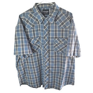 Wrangler, Men's XXL, Blue/White Plaid- Collared, Pearl Studded Snap Closure, 2 Front Peal Snap Closure Pockets, Short Sleeve, Cotton Shirt