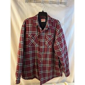Wrangler Mens 2x quilted flannel Burgundy Checkered. 100 cotton. 100 poly. measurs 26" chest, 30" long. good used condition.