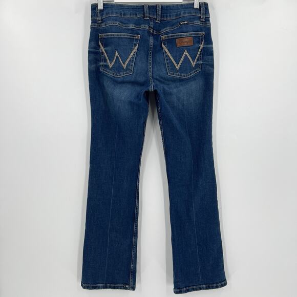 Wrangler Mid Rise Waisted Bootcut Boot Cut Jeans Blue Medium Wash Denim Stretch Western Cowboy Cowgirl Riding Women’s size 7 / 32. Excellent used condition, no flaws Approx measurements laid flat Waist: 16 inches Front rise: 10 inches Inseam: 32 inches Leg opening: 9 inches