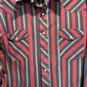 Wrangler red/blue/brown stripped pearl snap long sleeve shirt. Cuffs are pearl as well. 17.5x35.