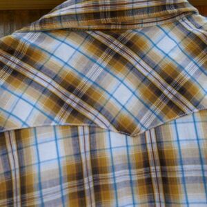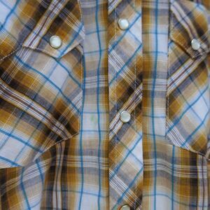 Wrangler Pearl Snap - long sleeve button up collared western shirt. Brown, blue and white plaid.