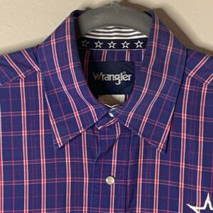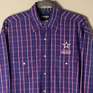 Wrangler Pearl Snap Shirt Med-Large National Patriot Logo Blue Plaid Rodeo Star